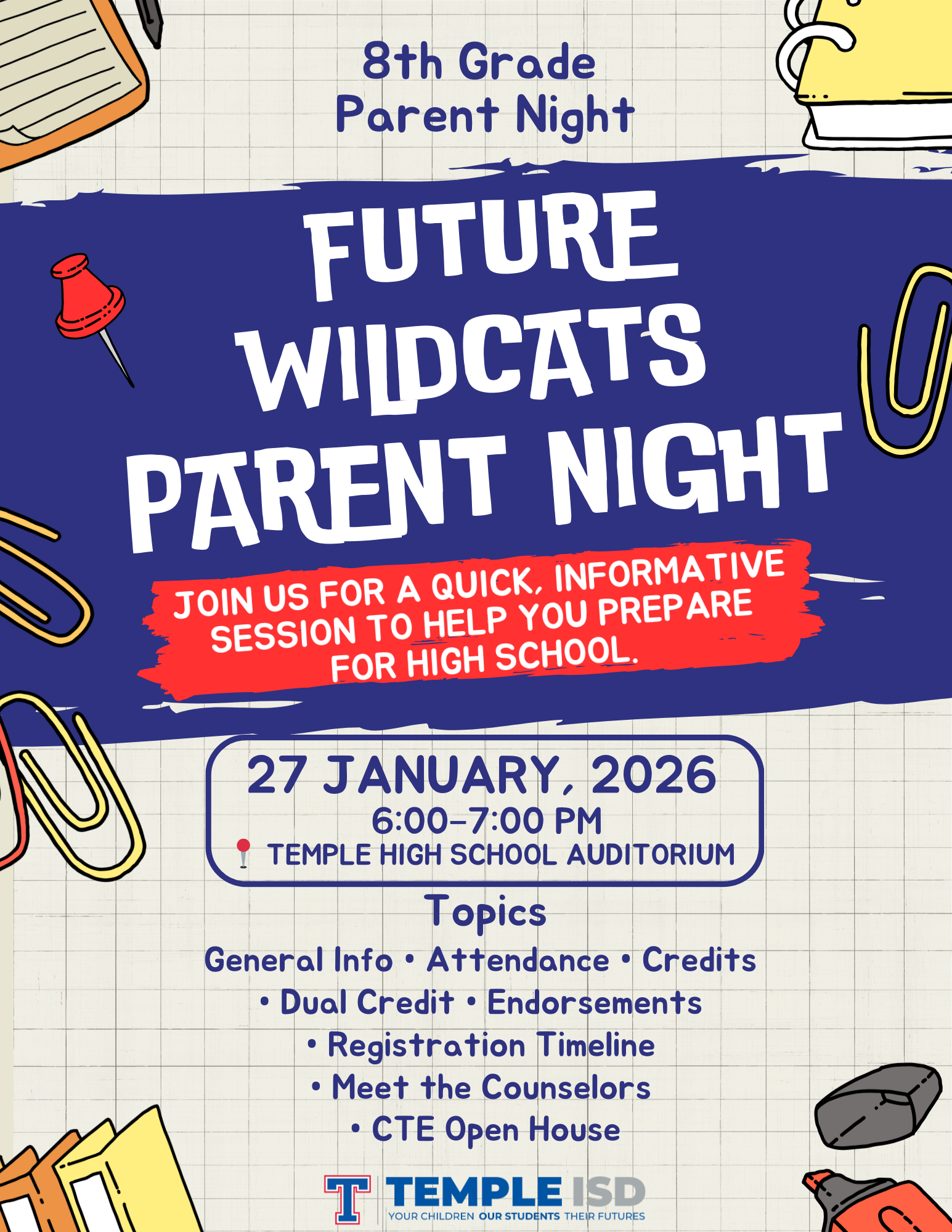8th Grade Parents are encouraged to attend on January 27, 2026 from 6:00 to 7:00 p.m. in the Temple High School Auditorium. Topics to be covered include: general information, attendance, credits, dual credit, endorsements, registration, and a CTE Open House.